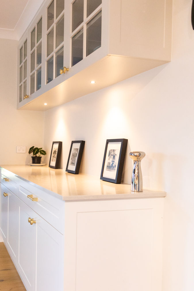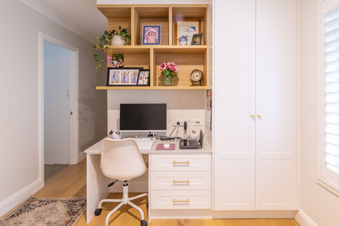 The laundry has been cleverly incorporated into the pantry space and concealed behind matching cabinetry doors—maintaining a seamless, uncluttered look while adding practical convenience. Nearby, a custom-designed study and storage unit continues the same joinery style, tying beautifully into the kitchen’s palette and materials. This thoughtfully integrated zone adds versatility to the home, offering a dedicated space for work, organisation, or quiet moments.